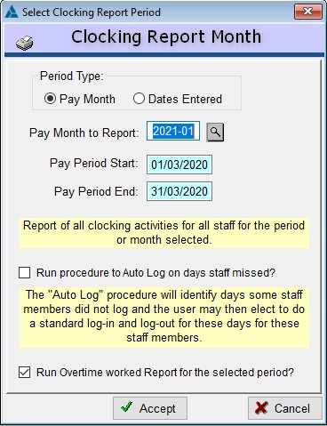 The report is accessed from the Staff Clock Record screen by clicking on the "Clocking Report" button and then selecting the required period (as seen below);