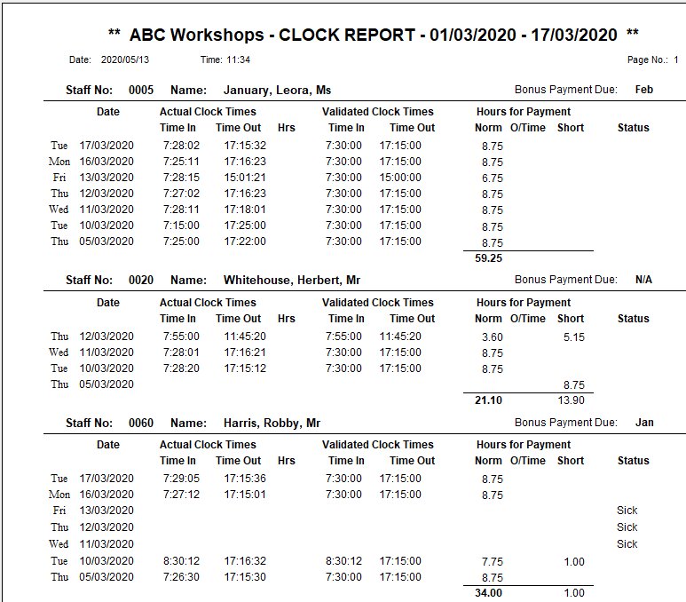 The Clocking Report is shown below (note the Bonus Payment Due with Months as indicated);