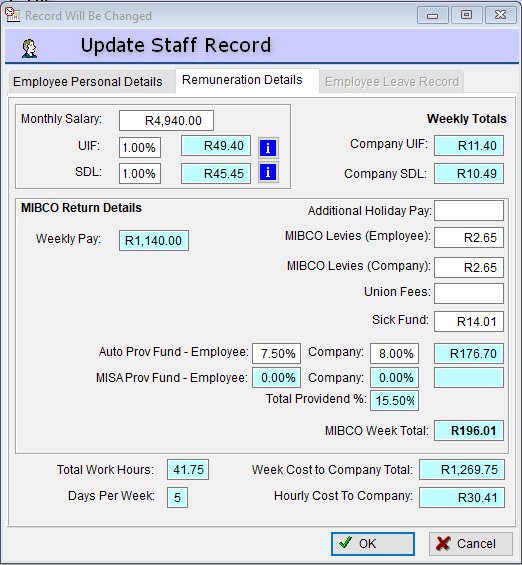 The information recorded here will be used to compare information on the return received from MIBCO (any differences will indicate changes in employment or benefits which will then require updating the MIBCO return) but will also provide the management with an accurate total hourly cost that this particular employee costs the company, inclusive of all employee contributions to SARS, providend funds, medical benefit, levies, etc.