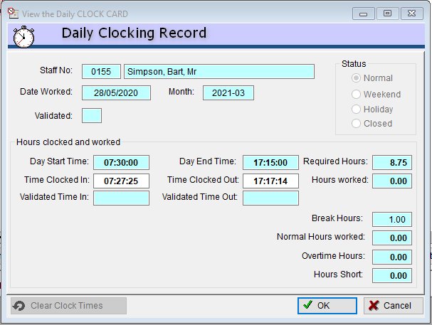 The "Daily Clocking Record" screen (as per the example below) has two key functions, namely;