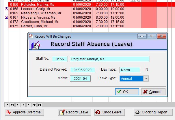 If the Leave Module has not been selected in the defaults settings the clocking screen will display two leave buttons, "Record Leave" and "Undo Leave". Clicking on the "Record Leave" button will provide the following update screen;
