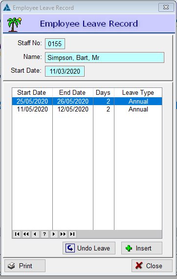 Leave may then be recorded by clicking on the "Insert" button, the following screen will appear and details of the appropriate leave may be recorded;