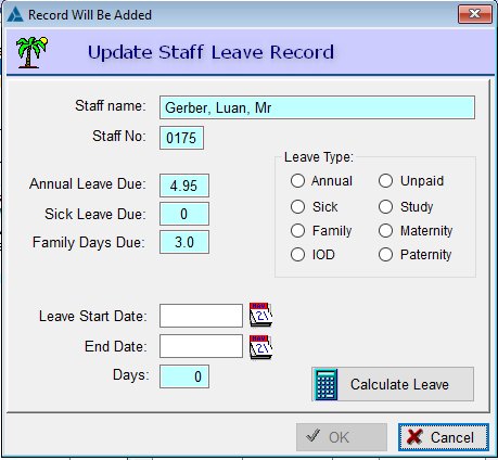 NOTE: If the Enhanced Leave module has been activated leave days requested in excess of the leave type available will not be accepted. The update screens will differ insofar as the Standard Leave module will not display details of leave days due.