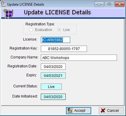 If you have previously selected “Evaluation” DO NOT select “Live” UNTIL you have applied for registration, made payment and received your registration details (via Email) as the system will proceed to validate the registration details entered and block any future access until the correct registration details have been entered.