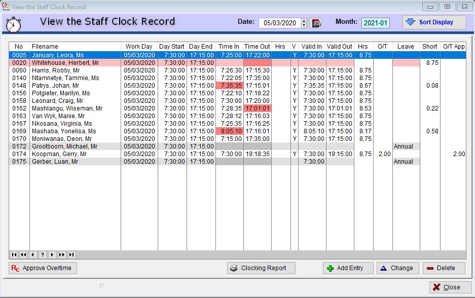 NOTE: Where employees clock in earlier than the valid starting time or clock out later than the valid day end time and who have NOT been authorised to work overtime (or exceeded the approved overtime hours) their clocking records will reflect the actual clocked times BUT during a payroll report run the system will validate their times and only calculate hours based on valid work hours. In other words they will not be credited with such extra hours.